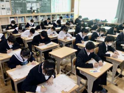1年生の社会科のテストの様子です。 11、12です。