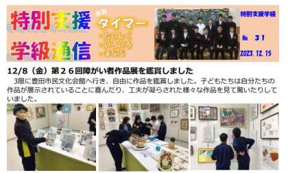 1,2,3,4学級通信最新号をお届けします 公開日 2023/12/09 更新日 2023/12/09 お知らせ 1,2,3,4学級通信最新号をお届けします。 ご覧ください。 ↓↓↓↓↓↓ ☆学級通信31 特別支援学級