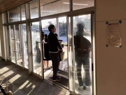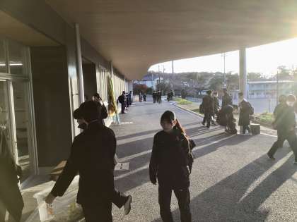 生徒会の生徒たちが挨拶運動の準備を始めています。