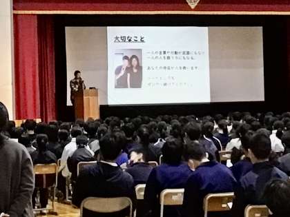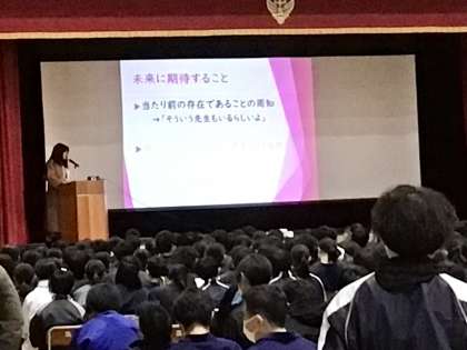 12/20(水)LGBTQ講演会2 公開日 2023/12/20 更新日 2023/12/20 学校行事 性的マイノリティーの方々は、左利きの割合と同じ、ということや鈴木さんや佐藤さんのような有名な名前ベスト6と同じぐらいの人数であることを知りました。