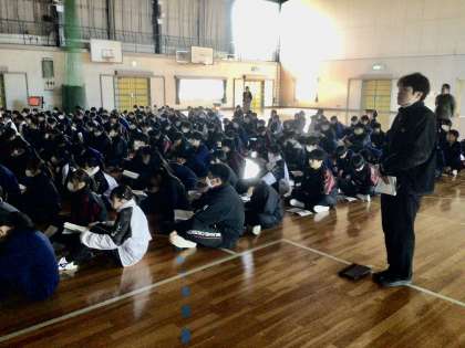 12/22(金)2年生学年集会2 公開日 2023/12/22 更新日 2023/12/22 各学年から 自然教室は、新潟県妙高高原町です。新潟県には、いったことのない生徒が多いと思います。万全の態勢で4日間を過ごしてまいります。 2年