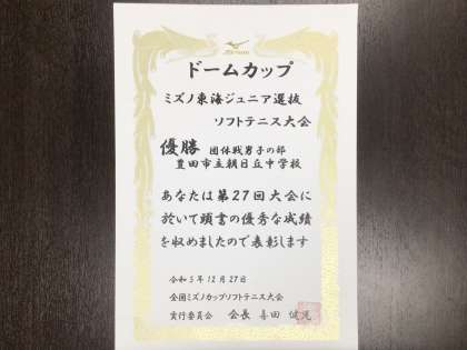 1/10(水) MIZUNO東海ジュニア選抜 ドームカップソフトテニス大会結果 公開日 2024/01/10 更新日 2024/01/10 お知らせ 冬休み中に行われた MIZUNO東海ジュニア選抜 ドームカップソフトテニス大会において、本校テニス部が団体戦男子の部で、見事優勝しました。ご報告いたします。
