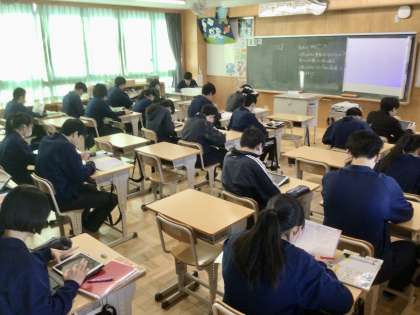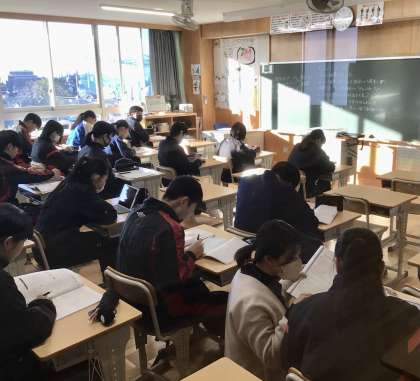1/16(火)3年生の朝の様子 公開日 2024/01/16 更新日 2024/01/16 各学年から 3年8組 7組 6組の 朝の活動の様子です。 3年生全体で、受験に向けての雰囲気作りをしていることがわかりますね。 3年