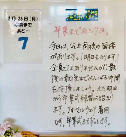 2/26(月)卒業まであと7日 公開日 2024/02/26 更新日 2024/02/26 各学年から あと、7回のおはようございます。(もうすでにおはようの後だから本当は、6回) あと、7回のさようなら あと、6回の給食 あと、6回の掃除 一つ一つを大切にしていきたいですね。 3年