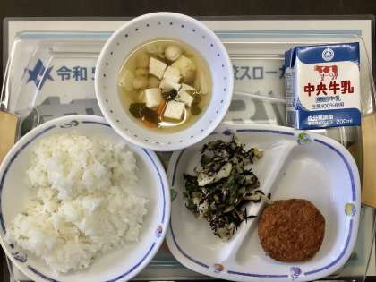 今日の給食は、 ⭐️骨太サラダ ⭐️蓮根サンドフライ ⭐️ご飯 ⭐️ふだま汁 ⭐️牛乳でした。