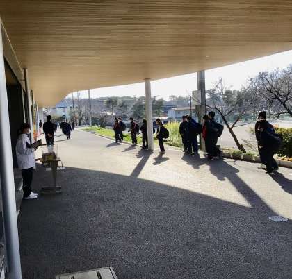 昇降口が開きました。生徒が続々と入ってきます。 同時にあいさつ運動が始まりました。