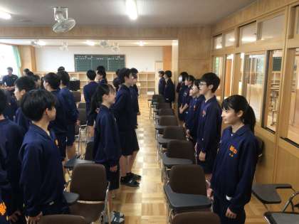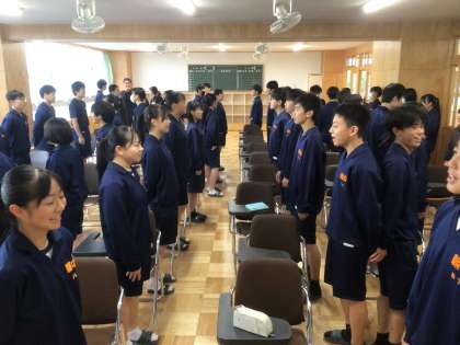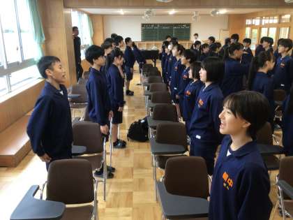 金曜日の認証式に向けて、3年生のリーダーが返事の練習をしています。朝から活気のある声が響いています。
