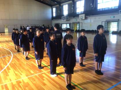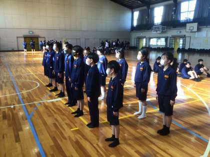 1年生のリーダーが、返事の練習をしています。大きな声でがんばっています。