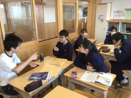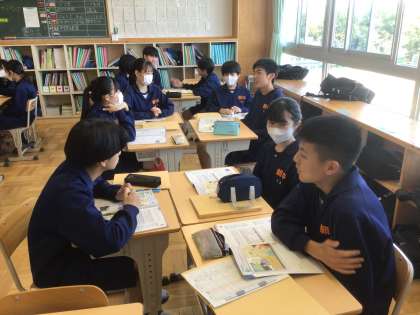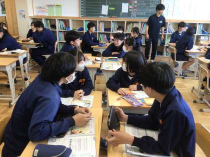 4/25(木)授業の様子1 公開日 2024/04/25 更新日 2024/04/25 輝く朝中生! 33学級の英語です。Favorite School Lunchをテーマに英語で会話に挑戦しています。 3年