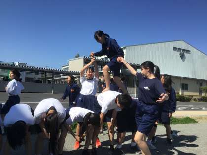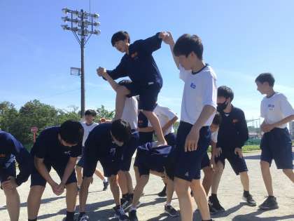 3年生の学年競遊「運命の綱渡り」の練習をしています。