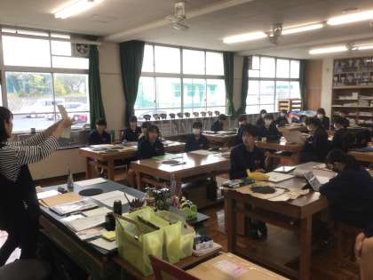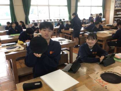 38学級の美術です。漆絵風皿の、皿の部分が今年から木製になりました。黒く塗っています。