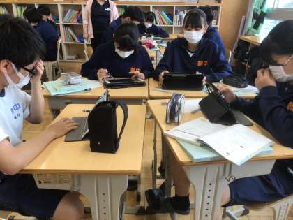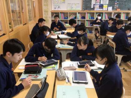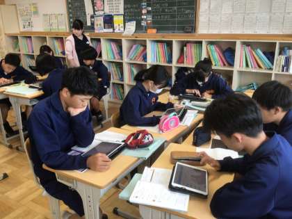 32学級の数学です。学習用タブレットを使って、因数分解に挑戦しています。