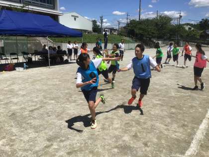 縦割り選抜リレーです。1〜3年生がバトンをつなぎます。