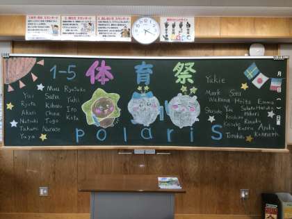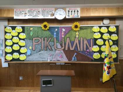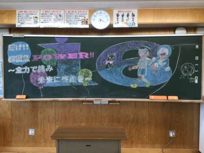前日に生徒が仕上げた黒板装飾です。14・15・16学級です。