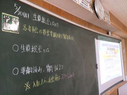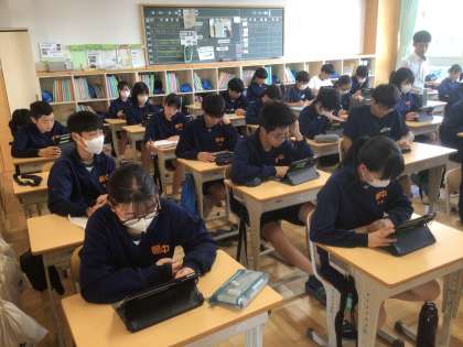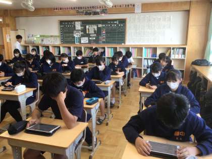 37学級の総合です。来週の生徒総会に向けて、全学級が学習用タブレットで要綱を読む時間です。