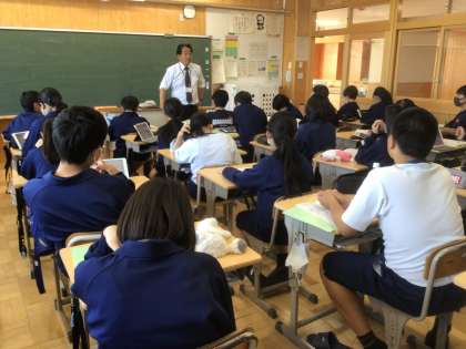 学年集会後、職場体験に向けて、体験する事業所について調べています。(写真は22学級です)