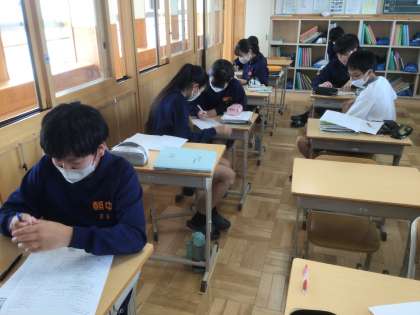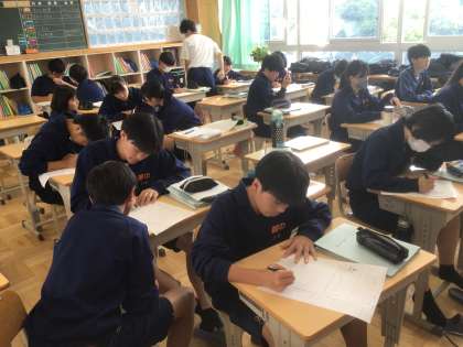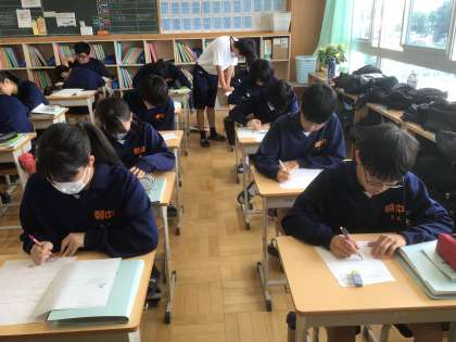 35学級の数学です。返却された単元テストの間違い直しをしています。