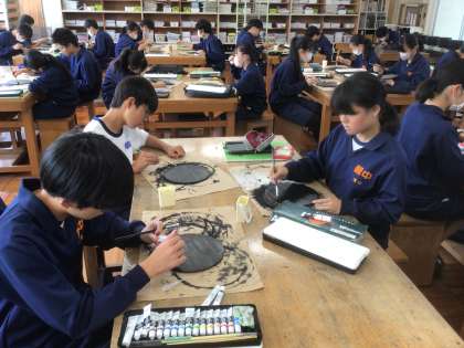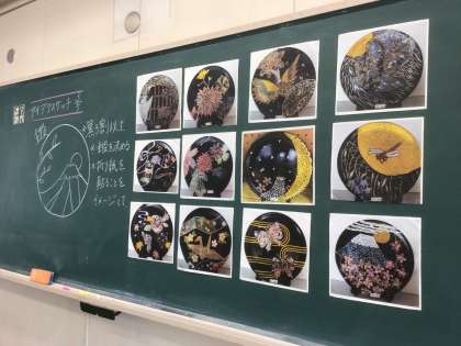 37学級の美術です。漆絵風皿を作成しています。