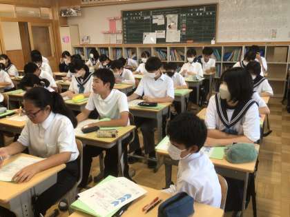 27学級です。職場体験の事業所の方とのやり取りを想定して、言葉遣いについて学んでいます。