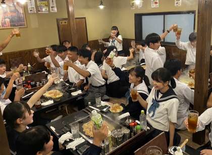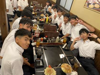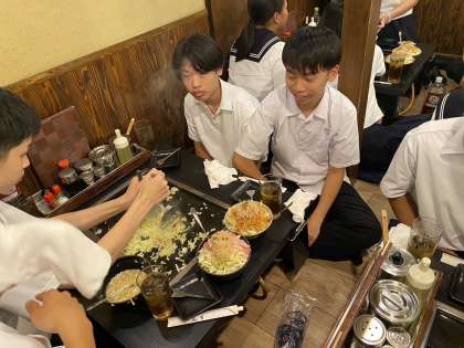 4組です。夕食でもんじゃ焼きを食べています。