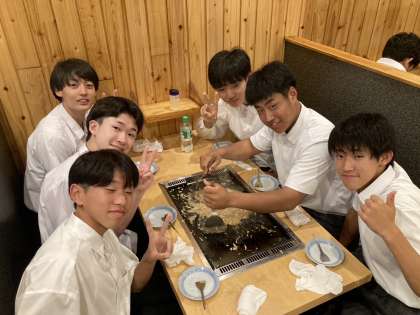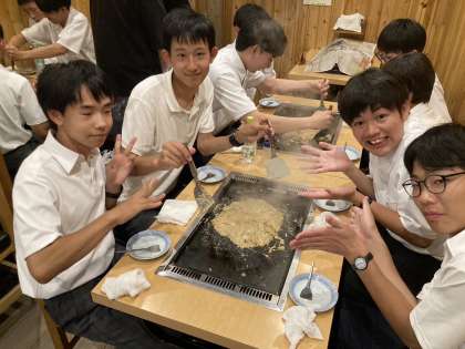 8組です。夕食でもんじゃ焼きを食べています。
