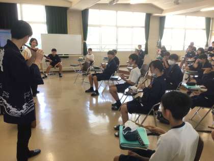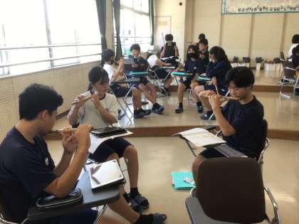 2年生は、音楽の授業で、挙母祭りの講師の方を招いて、篠笛を学ぶ会を行っています。写真は27学級です。