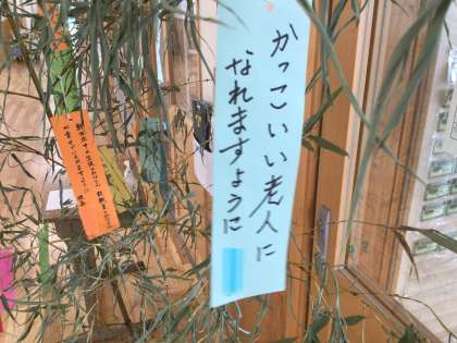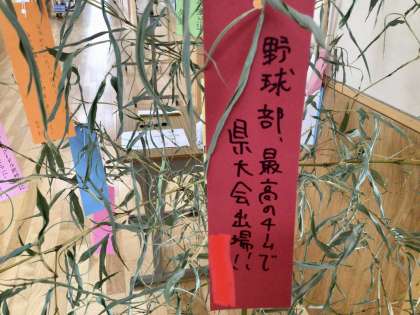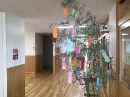 校舎の1階廊下に七夕に向けての笹が現れました。生徒も教師も願いをかけています。