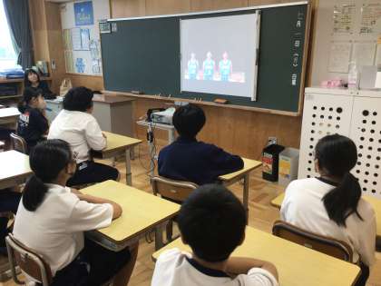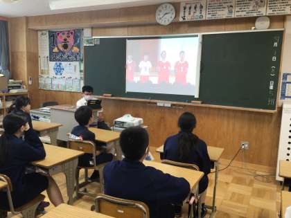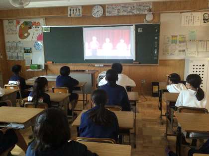 1年生の総合学習です。先週の壮行会の3年生の決意表明を動画で見ています。