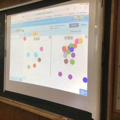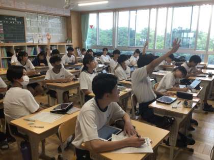 7/1(月)授業の様子4 公開日 2024/07/01 更新日 2024/07/01 輝く朝中生! 38学級の道徳です。学習課題は、「いい人ってどんな人?」です。学習用タブレットで、自分の立場をオンラインで表示しながら話し合いをしています。 3年