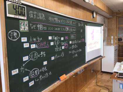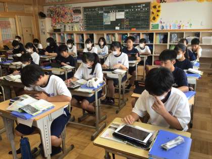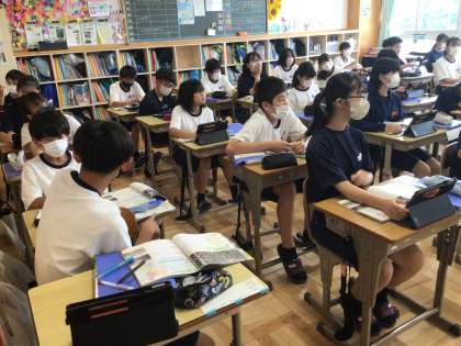 14学級の社会です。学習用タブレットを使って、学習しています。