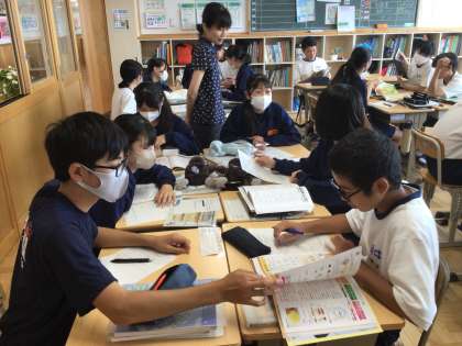 22学級の家庭科です。友達と協力して、弁当に入っている材料を食品群に分けています。