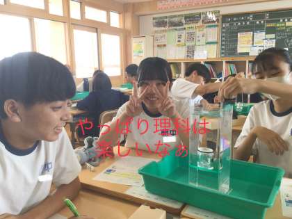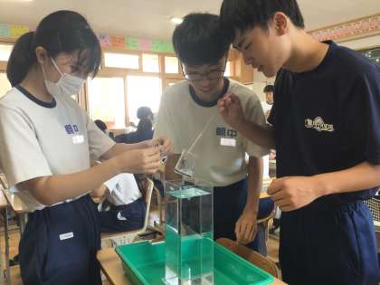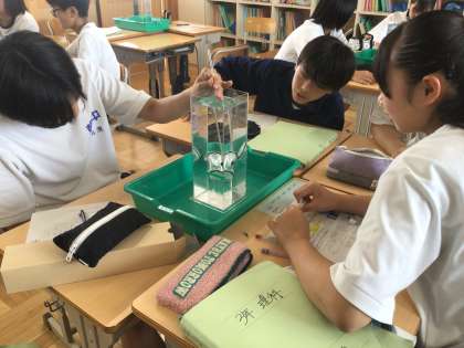 35学級の理科です。ゴム膜の変化を通して、水圧について学習しています。
