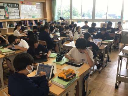 11学級の理科です。学習用タブレットで、粒子モデルを動かしながら考えています。