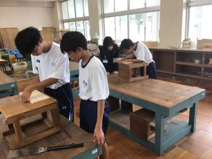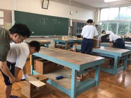 7/4(木)授業の様子5 公開日 2024/07/04 更新日 2024/07/04 輝く朝中生! 1・2・3・4・5・6学級の技術・家庭科です。ノコギリで木を切っています。(高校のインターンシップ活動の一環で、高校生が教師の仕事を補助する活動をしています) 特別支援学級