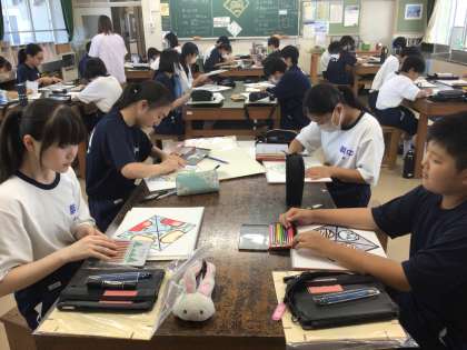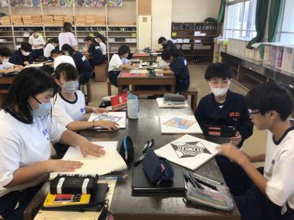 13学級の美術です。アートグラスの削るところを考えています。