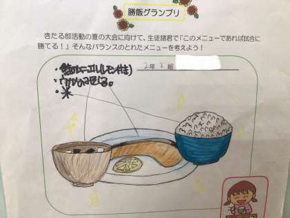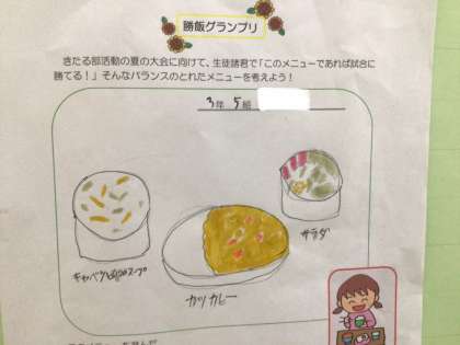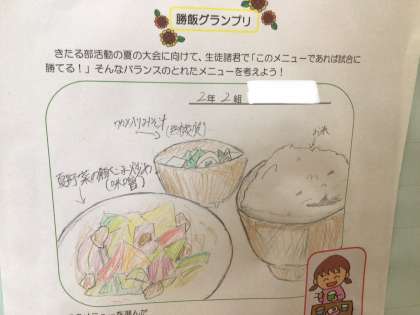 保健委員が考えた「勝飯」のメニューが、保健室前に掲示してあります。