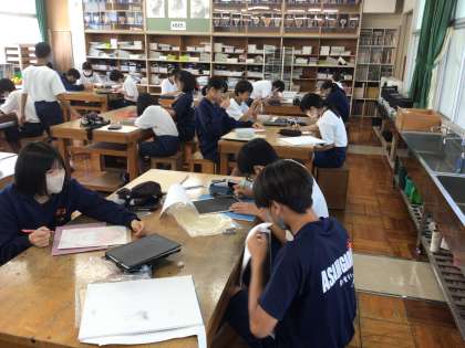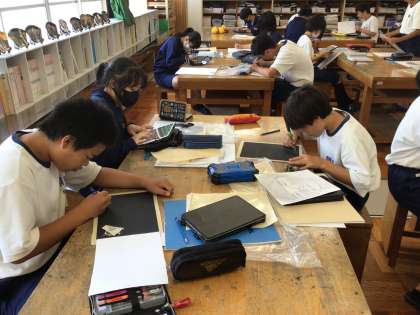 22学級の美術です。黒い塗料を彫刻刀で削り、自画像を描いています。