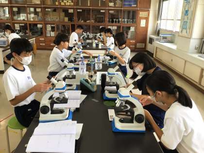 28学級の理科です。あじさいの葉の表と裏の違いを顕微鏡で観察しています。