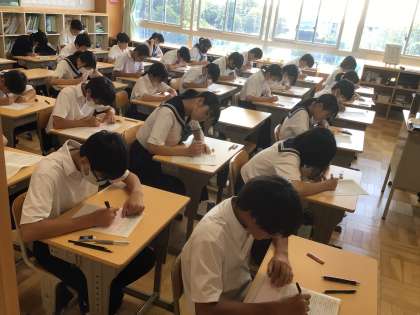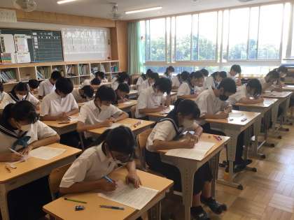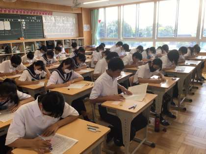 2年生は、3時間目は、保健体育のテストです。とても集中してテストに取り組んでいます。写真は21・22・23学級の様子です。