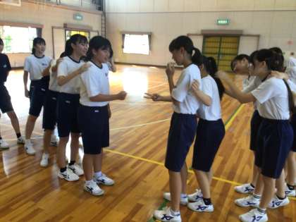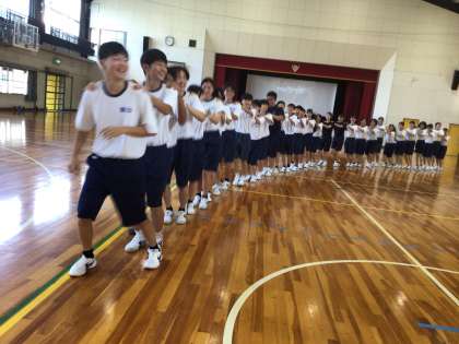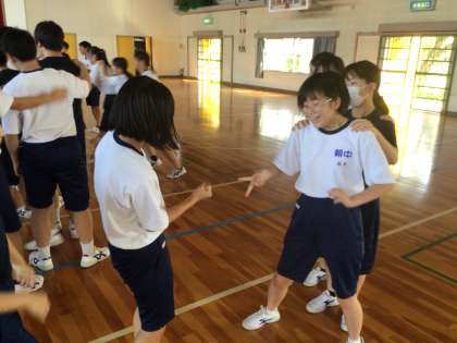 35・36学級の体育です。ジェンカのリズムに合わせて、楽しそうに踊っています。