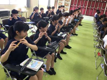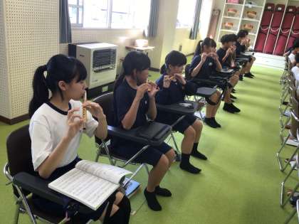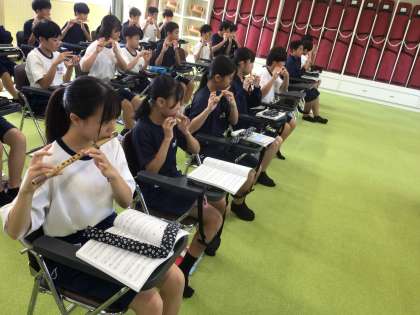 16学級の音楽です。姿勢よく篠笛を演奏しています。