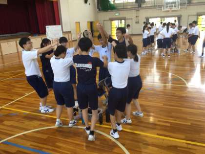 33・34学級の体育です。今日は「マイムマイム」のリズムに合わせて踊っています。