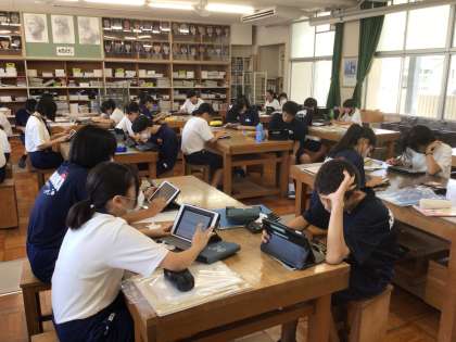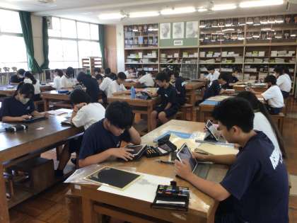 27学級の美術です。エッシャーの作品を見ながら、学習用タブレットで鑑賞文を書いています。
