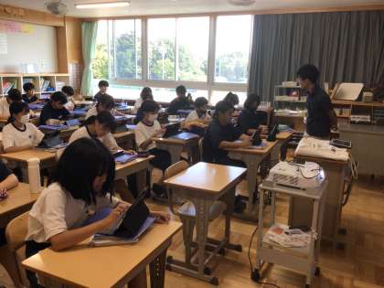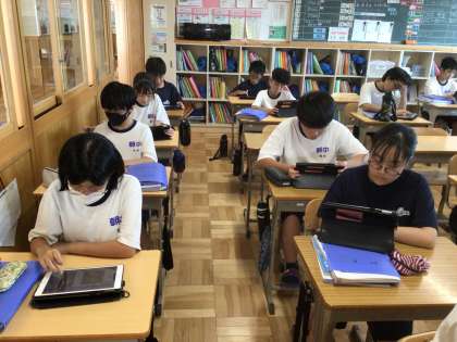12学級の社会です。二つの像を比べて、気づいたことを学習用タブレットに記入しています。