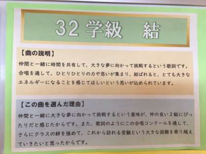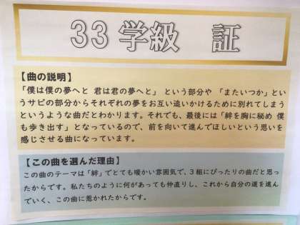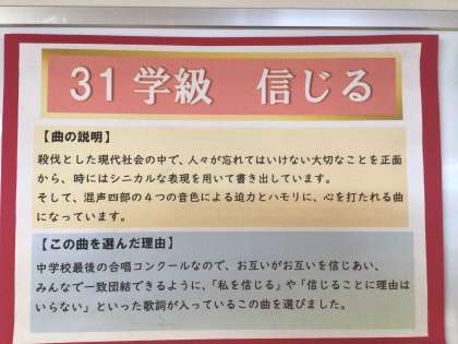 3年生の廊下に掲示してある、クラスの合唱曲紹介です。