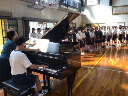 3年生は、体育館で学年合唱「大地讃頌」の練習をしています。