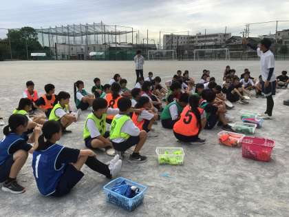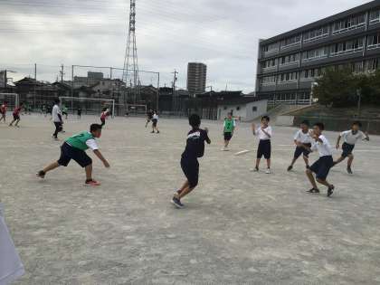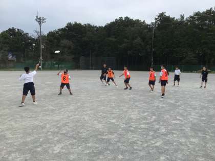 17・18学級の体育です。チームに分かれて、アルティメットの試合をしています。