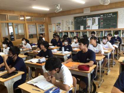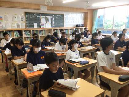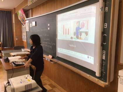 23学級の英語です。デジタル教科書を使って、教科書の英文を確認しています。