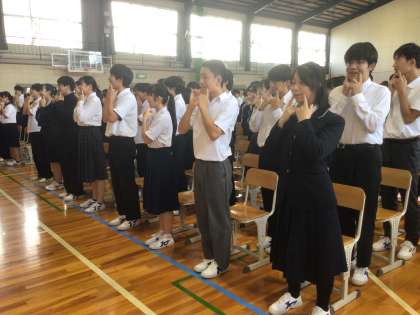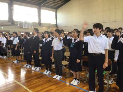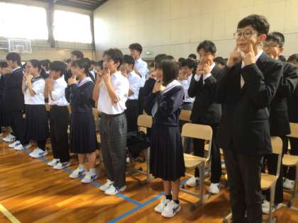 10/11(金)全校集会2 公開日 2024/10/11 更新日 2024/10/11 輝く朝中生! 本日で前期が終了します。終業式を前に全校で発声練習をしています。3年生が前に立ち、指示を出しています。