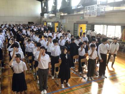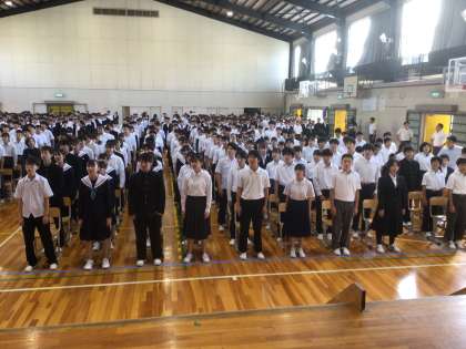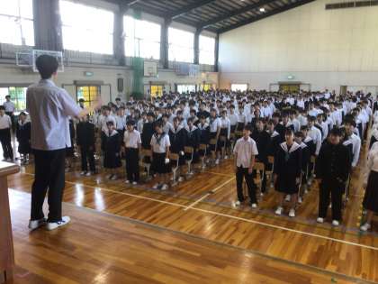 10/11(金)全校集会4 公開日 2024/10/11 更新日 2024/10/11 輝く朝中生! 本日で前期が終了します。終業式を前に全校で発声練習をしています。3年生が前に立ち、指示を出しています。
